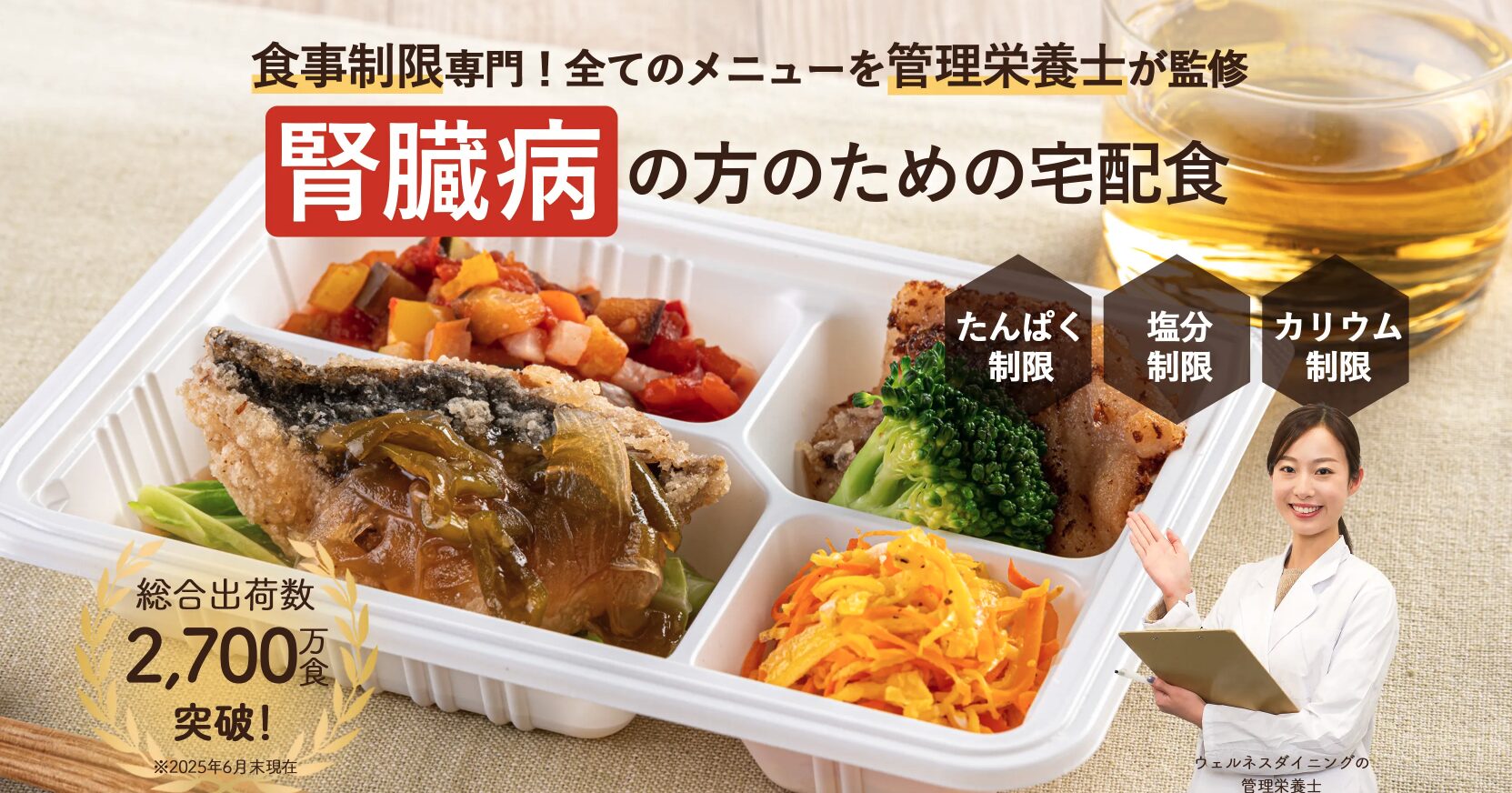 「ウェルネスダイニング」は管理栄養士監修による宅配弁当や料理キットを提供する宅配弁当サービス。腎臓病や透析中の方には「たんぱく&塩分調整気配り宅配食」がおすすめです。
