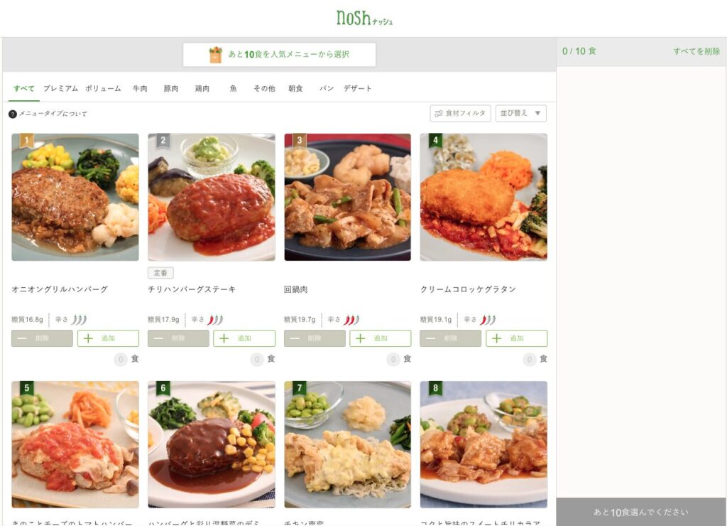 糖質に配慮したメニューを選べるのは、目的別や栄養別に調理されている冷凍おかず。メニューの一覧から糖質に配慮したメニューだけを表示したり、糖質の少ない順に並べ替えたりして商品を選択できます。