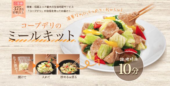 | 生協(コープデリ) | 4.6 | 下処理・カット済み食材を調理するだけ | 885円~ | 無料~198円(1注文ごと・利用金額によって変動) | 10~15分 | 2~4人分 | 定期 | なし |