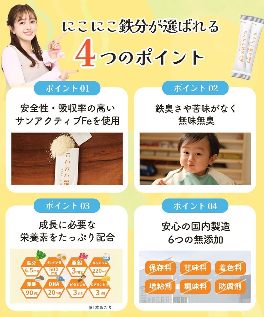 にこにこ鉄分1本分に含まれる鉄分の量は4.5mgです。これは1~2歳児の1日の鉄分摂取推奨量にあたります。