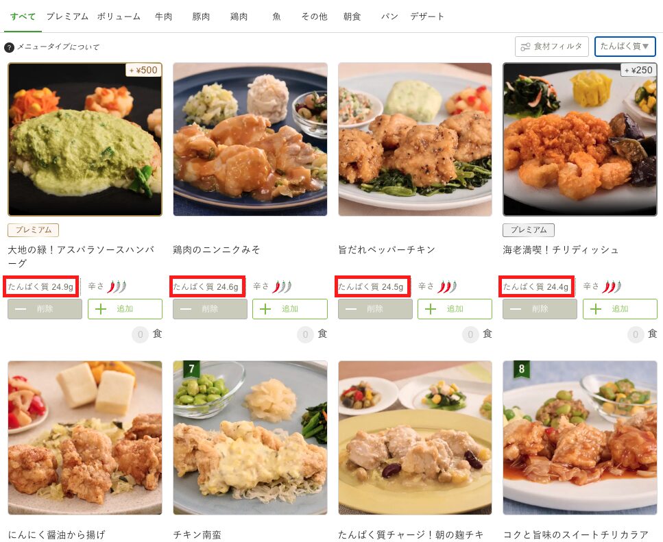 また、「タンパク質」からメニューを検索できるため、細かい栄養計算をせずに目標のタンパク質量を効率よく摂取可能です。